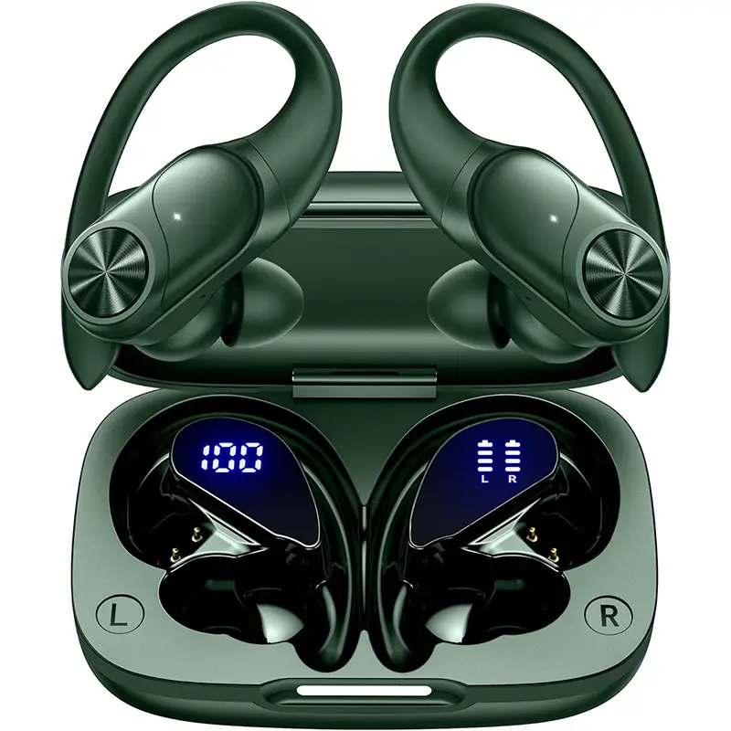 Bluetooth Headphones Wireless Earbuds 80hrs Playtime Wireless Charging Case Digital Display Sports Ear buds with Earhook Premium Deep Bass IPX7 Waterproof Over-Ear Earphones for TV Phone Laptop Olive